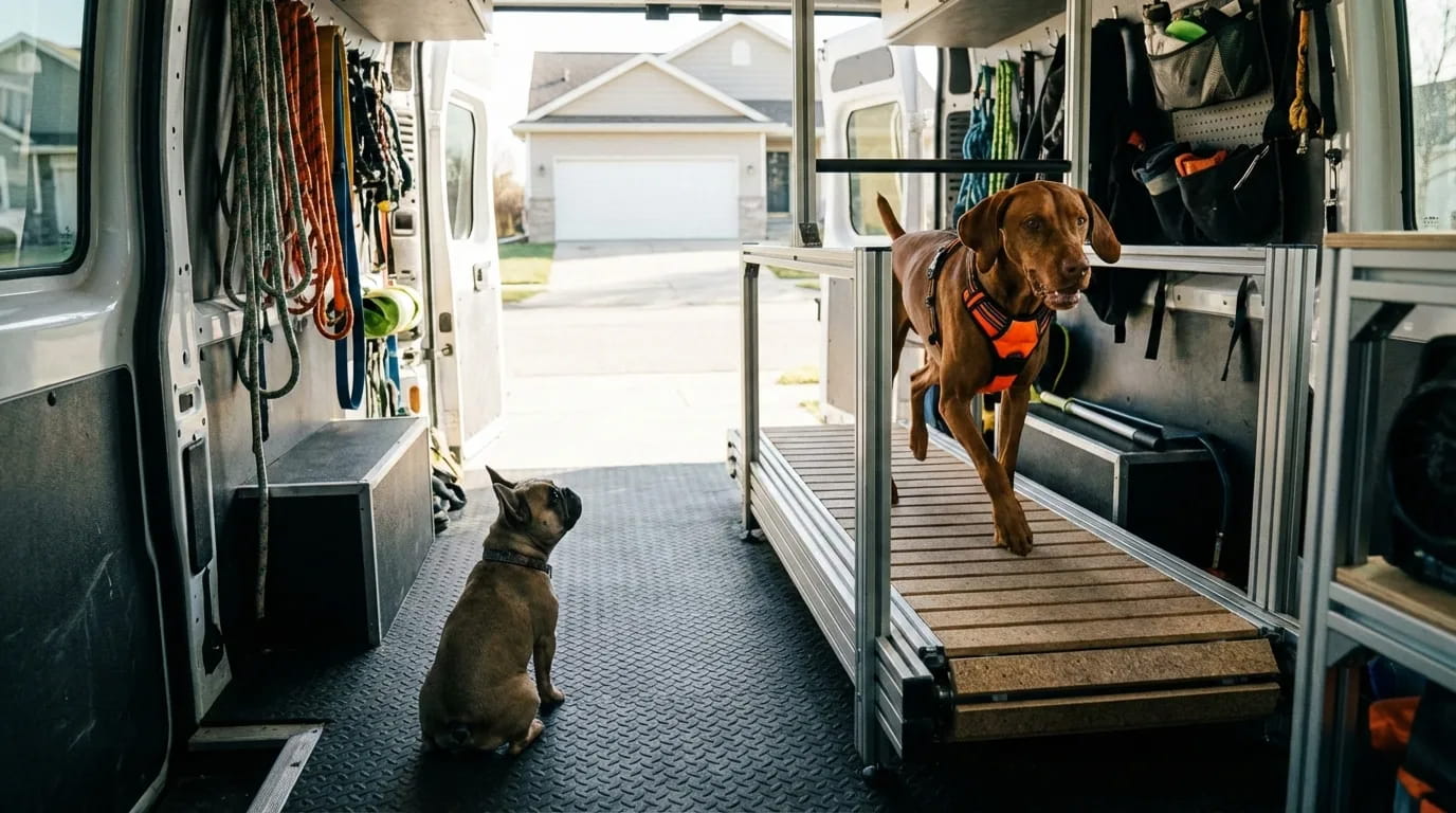 Notre gym mobile se déplace directement chez vous à Magog. Pas besoin de vous déplacer, pas de contraintes météo, pas de formation préalable. Notre entraîneur arrive avec tout l’équipement nécessaire et guide votre chien à son rythme. Simple, efficace et sans stress pour vous et votre toutou.