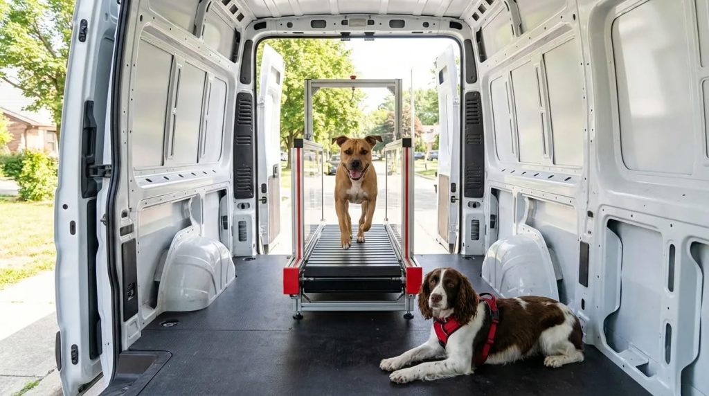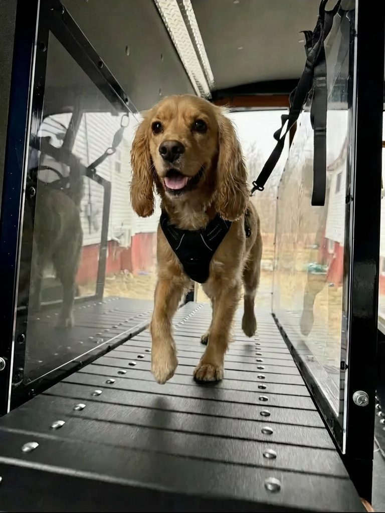 Toutou Gym est une fourgonnette climatisée équipée de tapis roulants non motorisés spécialement conçus pour les chiens. Nous nous déplaçons directement chez vous pour offrir à votre compagnon un entraînement sûr, efficace et adapté à son rythme.